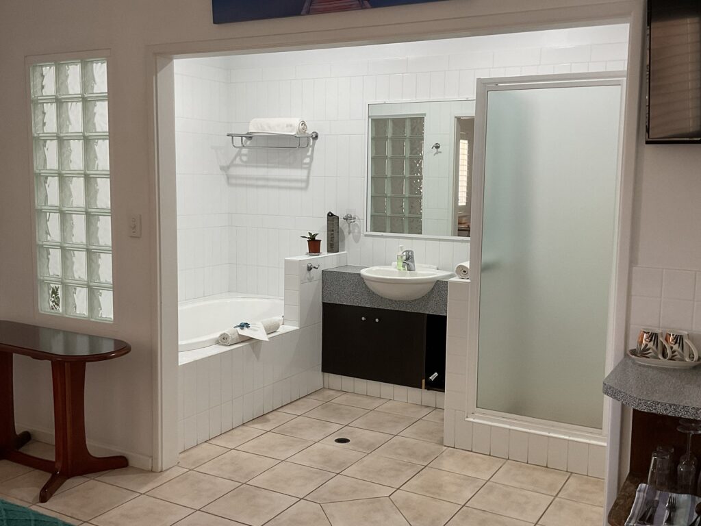 My room. It was light and airy and included all that’s needed for a comfortable stay including a king-size bed, spacious private bathroom with a bath, shower and separate toilet. In-room facilities included a bar fridge, tea and coffee facilities, bottled water and biscuits. Bathrobes, air conditioning and a ceiling fan ensured perfect indoor temperature control! A table and two chairs inside and outside the room offered several seating options depending on the weather. The room also featured a television while wi-fi was free.